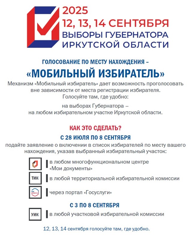 При проведении выборов Губернатора Иркутской области у вас есть право и возможность проголосовать 12, 13 и 14 сентября 2025 года на любом удобном для вас избирательном участке, расположенном на территории Иркутской области – вне зависимости от места жительства и регистрации в нашем регионе (механизм «Мобильный избиратель»).