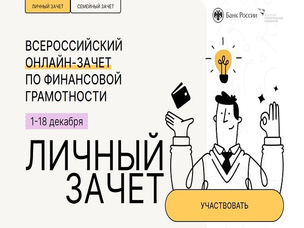 В рамках реализации Стратегии повышения финансовой грамотности в Российской Федерации на 2017-2023 годы с 1 по 18 декабря 2022 года пройдет пятый ежегодный Всероссийский онлайн-зачет по финансовой грамотности.