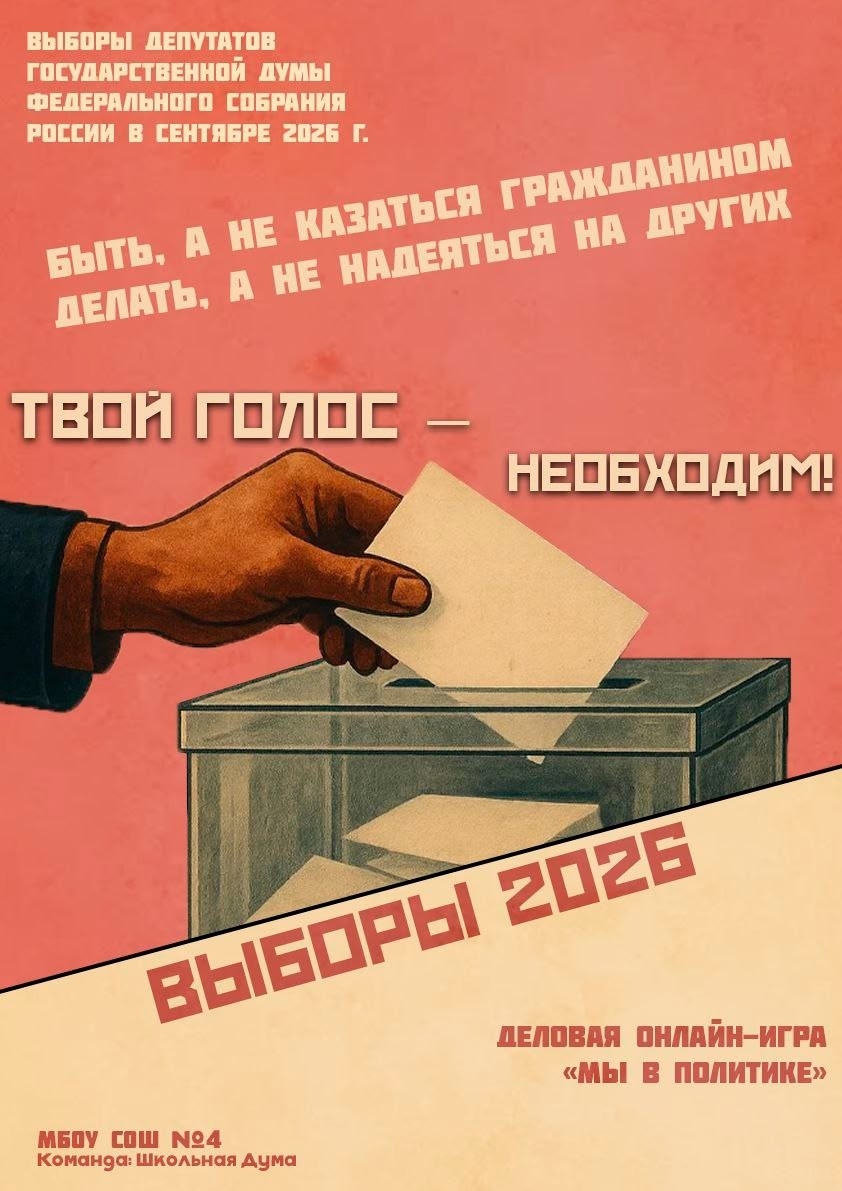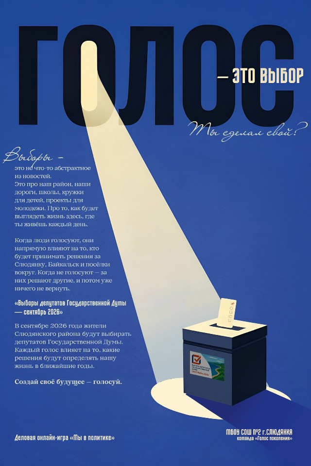 Конкурсная комиссия оценила информ-плакаты "Создай свое будущее - голосуй!" - задание второго этапа онлайн-игры "МЫ в политике". Напомним, в политическом челлендже принимают участие команды девяти школ. Слюдянского района. Суть задания - создать и разместить информационный плакат (цифровой постер), который мотивирует молодых избирателей на участие в выборах депутатов Государственной Думы России в будущем году.
